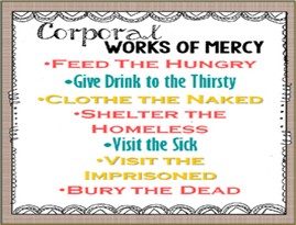 As mentioned at the Masses last weekend, our students in the Faith Formation program are learning about the Corporal Works of Mercy. However, in a sense, we are all involved in a faith-formation process. Every day is a school day, and every day, as Christians, we are urged to engage in the discipline of practicing the Corporal Works of Mercy.